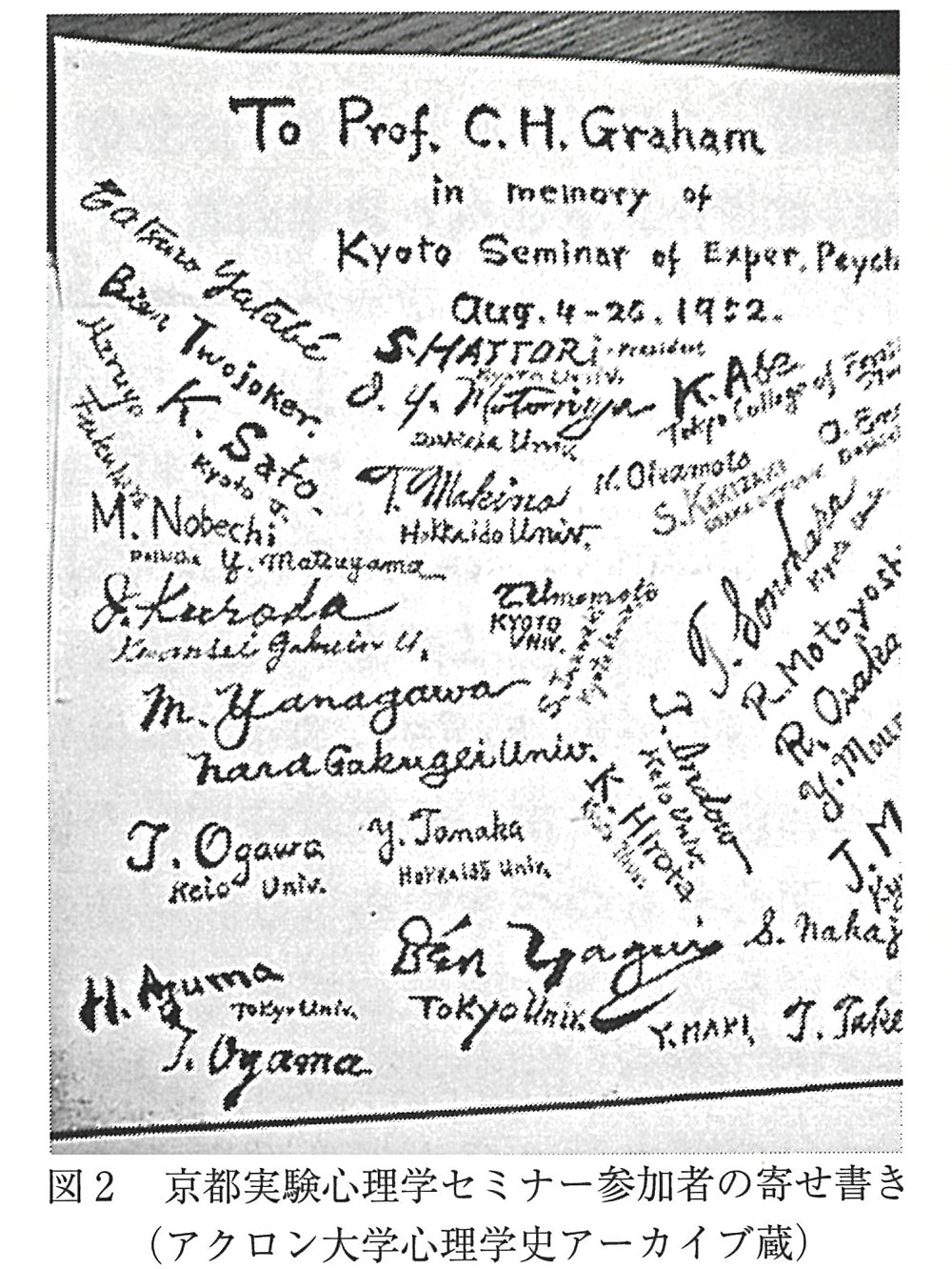 彼らがセミナー終了後にグレアム教授に宛てた寄せ書きが残っており、ウエップ上で問覧することができます(「京都実験心理学セミナー」参加者の寄せ書き、京都大学、歴史館、心理学ミュージアム、日本心理学会(psychmuseum.jp/collectionkt/2020年3月3日閲覧)。しかし、残念なことに左隅に書かれた大山先生の名は欠けており一部しか見ることができません。そこで、ここではアクロン大学心理学史アーカイブが所蔵する原本を示したいと思います(図2)。東洋先生の下に大山先生の名が見えます。