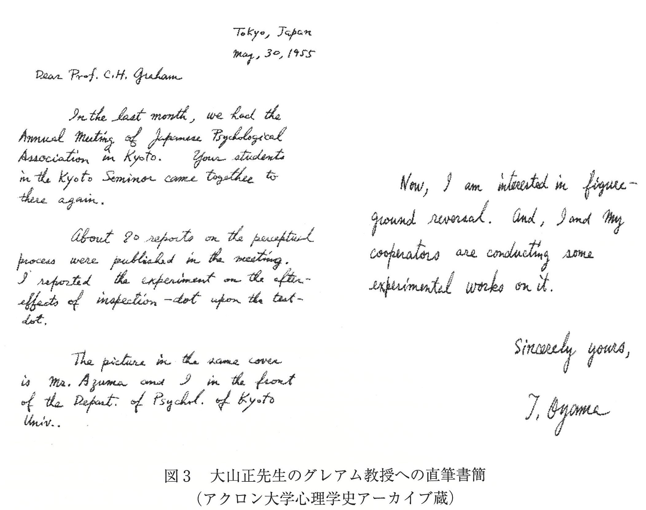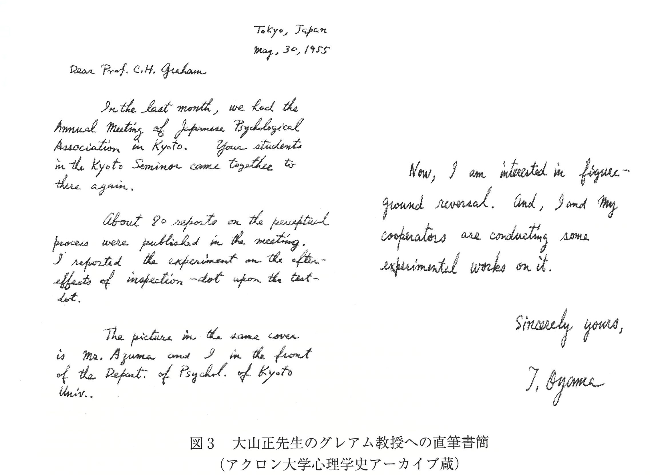 文中、大山先生が別便でグレアム先生に送られたというのは、日本語の論文で大山正「図形残効の実験的研究(Ⅱ)-空間的要因についてー」「心理学研究」25巻3号195-206頁(1954)ではないかと思われます。大山先生が初めて英語で書かれた論文は、1956年のJapanese Psychological Researchの3巻25-36頁に掲載されたTemporal and spatial factor infigural after-effects で図形残効がテーマです。しかし、書簡の日付より後なので別刷を送ることは不可能です。
